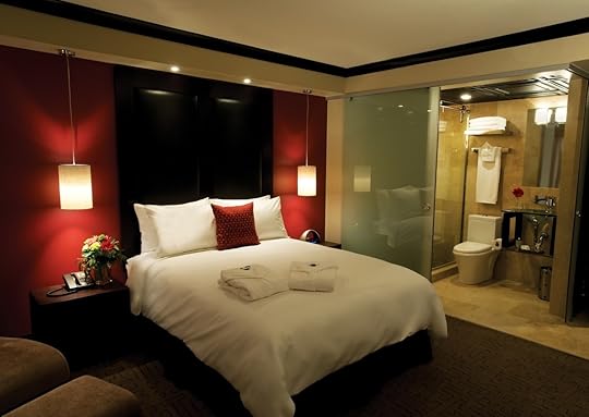 A large room decorated in red, black and white. There are many cushions around everything, and they make it easy to tell exactly how rich she is. Real leather covers many of the couches, and she has dozens of soft pillows. Her TV is great, a large flatscreen with great reception and image, and she has tons of video game supporters.