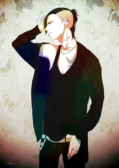 Hair: One half of it reaches his shoulders and is a deep obsidian tone while the other side is near cleanly shaven off. He normally keeps his hair down or throws it back in a loose ponytail.