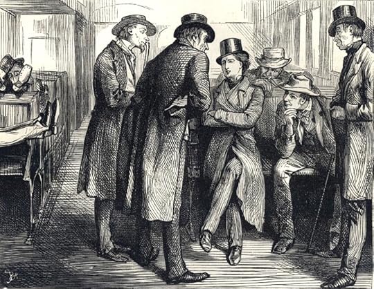 While several travellers sleep on the hard, wooden seats with their feet indecorously displayed (left), Barnard's American gentlemen crowd around Martin (top-hat) and Mark (soft hat) to query the young Englishmen about Queen Victoria's residences. Barnard makes Martin look perfectly serious in stylish topcoat, while Mark has a bemused smile that communicates the artist's attitude towards his material. Refreshingly, Americans in these episodes feel no reticence in engaging perfect strangers in conversation if they are seeking information about foreign places and persons. Here, however, Dickens makes them thoroughly gullible as he has Mark pass off spurious observations about the Mint and Mansion House, much to the delight of contemporary English readers.