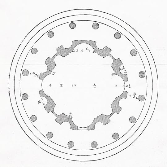 Brunelleschi's solutions were ingenious. The spreading problem was solved by a set of four internal horizontal stone and iron chains, serving as barrel hoops, embedded within the inner dome: one at the top, one at the bottom, with the remaining two evenly spaced between them. A fifth chain, made of wood, was placed between the first and second of the stone chains. Since the dome was octagonal rather than round, a simple chain, squeezing the dome like a barrel hoop, would have put all its pressure on the eight corners of the dome. The chains needed to be rigid octagons, stiff enough to hold their shape, so as not to deform the dome as they held it together.