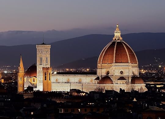 Brunelleschi's Dome, the nave, and Giotto's Campanile of the Cattedrale di Santa Maria del Fiore as seen from Michelangelo Hill at night.