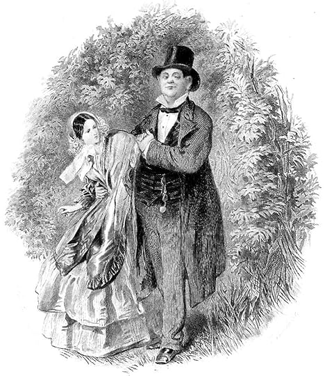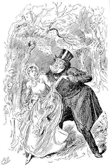 However, Although he is successful at conveying both Mary's fashion sense, beauty, and reluctance, Gilbert does not rise to the comic possibilities that Dickens has offered him in Seth Pecksniff's sheer obtuseness. The persuasive voice and oily manner of the arch-hypocrite are inadequately presented in Gilbert's image of Pecksniff as a successful, well-dressed bourgeois of middle age. Although Gilbert's middle-aged professional man is self-assured, he is not funny, so that the reader delights more in the sheen of Mary's silk shawl than in Pecksniff's unconscious imitation of Satan accosting and attempting to seduce Eve in Paradise. Having achieved a satisfactory realisation of the glade in which Pecksniff encounters Mary, Gilbert has elaborated upon the text in terms of the figures' fashionable attire, but has almost entirely failed to realize the scene's verbal, physical, and character comedy. He does, however, set up expectations in the reader that Pecksniff's greed will induce him to pursue Mary romantically in hopes of ingratiating himself with Old Martin. The proleptic reading of the illustration does not include apprehensions about Mary's safety or the possibility of sexual violation, however, since to the reader already familiar with his character from volume one Pecksniff is hardly representative of the Victorian type known as the masher.