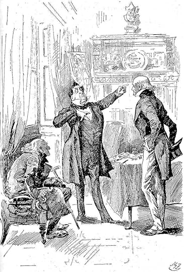 Pecksniff's theatricality and central position suggest that he dominates the scene, but Tom neither flinches nor retreats, standing his ground; meanwhile, Old Martin watches wordlessly, assessing the behaviour and character of each adversary. On a drawing-board behind the arch-hypocrite is a haloed angel or saint in a pious pose, underscoring Pecksniff's outward piety. The sideboard behind Tom and Pecksniff is surmounted by a bust of Pecksniff, implying his vanity and egotism. The substantial piece of furniture bears a loving-cup and rondel celebrating Pecksniff's character ("Good Fellowship, Pecksniff"), even as he reveals his true colours at last to Tom — and to Old Martin. In the plate, Tom's clenched left fist may imply his exercising restraint by not punching the humbug whom he has for years thought a good and decent employer. These are precisely the sorts of embedded details and commentary that Phiz was accustomed to employ in his illustrations, but that Fred Barnard and the other Seventies realists rejected.