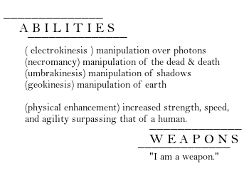 powers:: death whisper, death prediction, death touch, shadow-walking