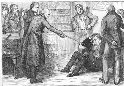 Another set of footsteps is heard upon the stairs. It is Mr Pecksniff. Pecksniff looks around the room and immediately launches into an attack on one and all (with the exception of old Martin). As Pecksniff approaches old Martin to give him yet another snake-like embrace Martin Chuzzlewit stands and grasps a stick and beats Pecksniff to the ground. Next, Martin orders that Pecksniff be dragged away and taken out of his reach. Mark Tapley then physically drags Pecksniff to the corner of the room. Old Martin then passionately embraces his grandson. Old Martin then says that the deep curse of the family has been “the love of self.” He says he regards Mary as his daughter and is aware that Pecksniff had designed one of his daughters to be the future wife of young Martin. Meanwhile, Pecksniff listens to all this and snivels in the corner of the room.