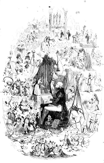 Lester decodes the swirling composition as a Cattermole-like fantasy or "abstraction" in which Phiz goes well beyond the fancy that Dickens suggested to make the organ-playing Tom a metaphor for the artist in any medium — "another image that presages" R. W. Buss's watercolor study Dickens's Dream (circa 1870). Among the myriad of characters floating about the musician are John Westlock, Ruth Pinch, Martin Chuzzlewit and Mary Graham, Mark Tapley and Mrs. Lupin, and "anthropomorphised musical notes drawn on manuscript pages". At the very bottom of the design half-a-dozen Pecksniffs play with masks, a suitable emblem for the constantly posing arch-hypocrite.