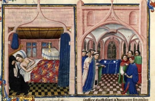 Immagine che illustra la situazione narrata in uno dei racconti più famosi della prima giornata, la novella di ser Ciappelletto (o Cepparello), che fa satira sia sulla dabbenaggine degli uomini di chiesa, sia sull'ipocrisia del ceto mercantile*.