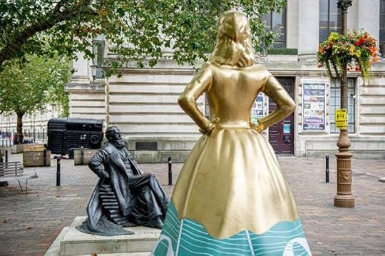 A sculpture of Charles Dickens's sister, Frances, has just been placed opposite his statue on Guildhall Walk, in Portsmouth, where Charles Dickens was born, It's a temporary sculpture, to fit in with a series. The design of Frances is in gold and green. She stands overlooking her brother’s sculpture, which depicts him reclining on a stack of books: