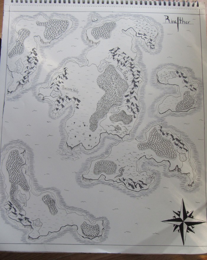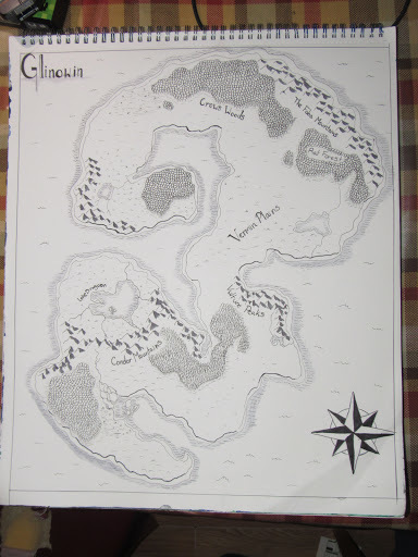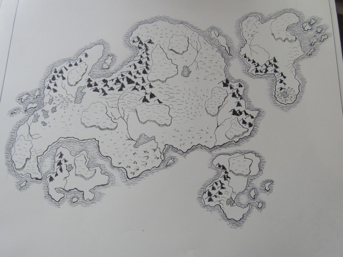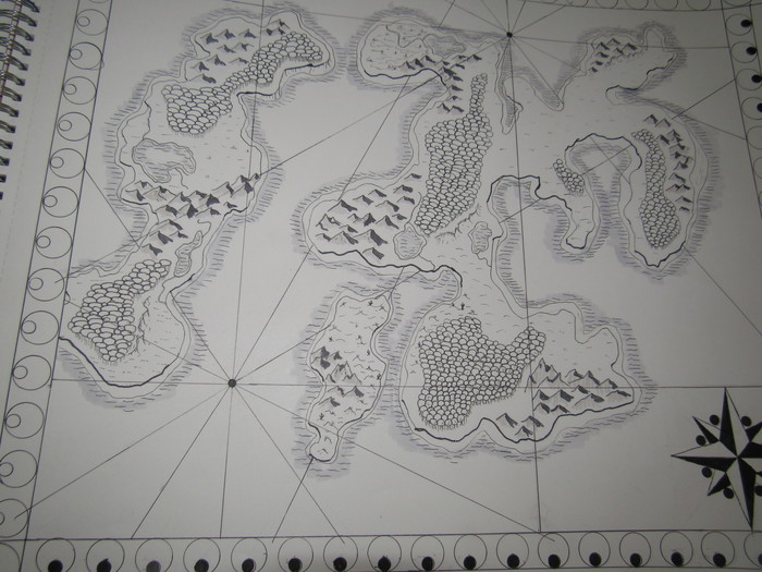 So I decided to try and draw a map instead of paint one. It was going swell, I'd drawn all the land, and mountains and inked them. Then when I had about an eighth of the mountains left to shade, the stupid pen died. That wasn't a bit problem cuz my mom had another one (the now dead one was hers too). Well, I go to find the other one and it is literally NOWHERE!! We were looking for a good 15 minutes for this pen. So I cant finish drawing and I haven't been able to go get more because school just started.