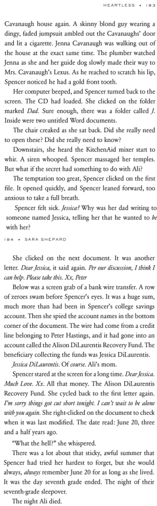 i feel that maybe ali is alive and she was a, trying to get the girls to figure out what was going on so she can try to come back but when wilden set fire to the woods he ruined her plan. something is way up with melissa she's up to something, maybe she already knew ian was alive and trying to help him or she's serectly dating wilden and helping him.... i dk, but i am so anticipating on heartless to hurry up and come out like new moon!