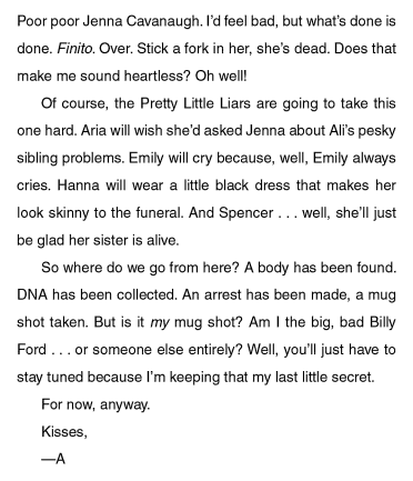 Hanna's trading in her Dior trench for a straitjacket. Aria's trying to contact the dead. Emily's dumped her boyfriend and is skipping town . . . again. And Spencer thinks someone in her family has gotten away with murder.