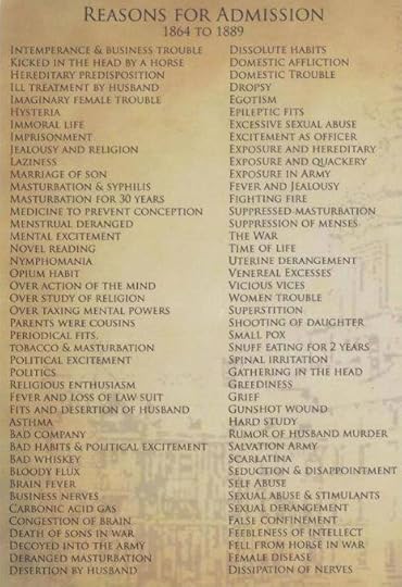 Oh My! Uterine Derangement. How does one spot a woman whose uterine is deranged. Greediness? Heck you could put half of the people I know in there if greediness counts. And, Small Pox would seem to need a hospital not a mental asylum. Thanks for this, Jean. How amazing.Just spotted "novel reading"...I suppose they would be coming for me.