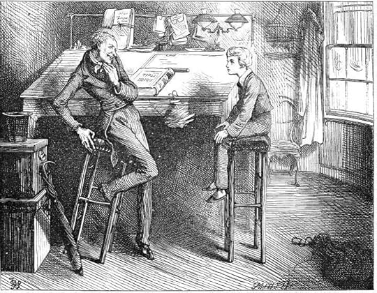 Near the end of the commentary for this illustration is mentioned how David is an observer. He certainly is, but the narrative form and style make an interesting frame. David, as an adult, is telling the story of his life. As an adult, David must cast his mind back to when he was much younger and an observer of life. And yet, as the narrator of the novel, David is always an observer whether he is young or old. I find that interesting and quirky.
