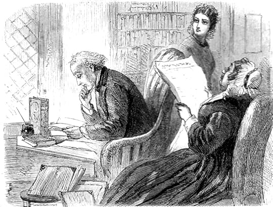 Realizing well the book's "May/December" marriage partners, the eighth illustration offers yet another atypical model for a middle-class family structure: the elderly scholar, Dr. Strong, his beautiful young wife, Annie, and her interfering mother, whom the boys at Dr. Strong's school in Canterbury have scornfully dubbed "The Old Soldier" by virtue of her self-centred determination to dominate her daughter's household and put her own personal interests ahead of everyone else's. Eytinge has provided a number of contextual details for the setting in which the action occurs — including Dr. Strong, working on his notes for his book (left), the Old Soldier, reading her newspaper (right), and the young wife between the two, a position which exemplifies her divided loyalties and dramatizes her sense of alienation. As in Phiz's depiction of the Strongs in the original serial illustrations, the old scholar has a tumbled pile of books beside him, and seems oblivious to the presence of his wife and mother-in-law. The leaded-pane window (right), large, comfortable chairs, and the book-lined room suggest that the group are in Dr. Strong's library.