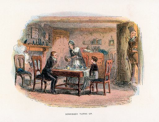 For the second illustration in the sixth monthly part, for October 1849, Phiz reintroduces Wilkins Micawber (right, in the doorway) somewhat improbably as David pays a visit to the "umble" cottage of Uriah Heep, Mr. Whitfield's legal clerk, and his mother. One can scarcely credit the coincidence of the Micawbers' abandoning London for a provincial capital in hopes that "something will turn up" and (not to put too fine a point upon it) that they can escape debts amassed in the capital. The illustration serves to introduce the obsequious clerk and his pious mother into the narrative-pictorial sequence. The textual passage realized is this: