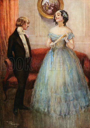 But I do waltz (pretty well, too, as it happens), and I take Miss Larkins out. I take her sternly from the side of Captain Bailey. He is wretched, I have no doubt; but he is nothing to me. I have been wretched, too. I waltz with the eldest Miss Larkins! I don’t know where, among whom, or how long. I only know that I swim about in space, with a blue angel, in a state of blissful delirium, until I find myself alone with her in a little room, resting on a sofa. She admires a flower (pink camellia japonica, price half-a-crown), in my button-hole. I give it her, and say: