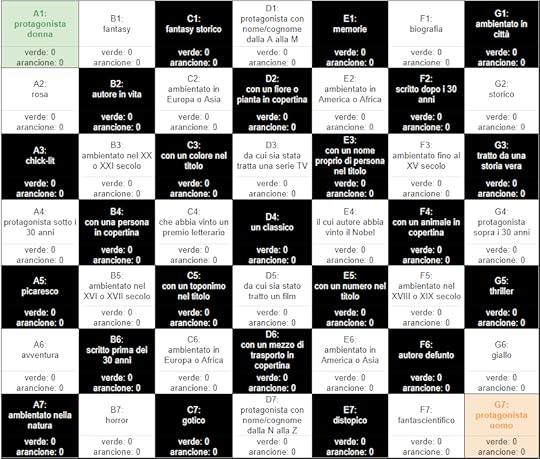 - Ciascun membro della Squadra Verde dovrà, possibilmente entro il 31/10, dichiarare con quale libro intende conquistare la casella A1: Protagonista Donna. Dovrete quindi scegliere un libro dalla cui sinossi emerga chiaramente che il protagonista della storia è di sesso femminile.