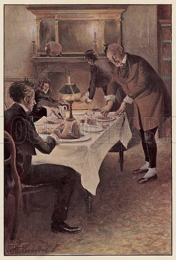 To link the earlier dinner with Steerforth to the dinner of this chapter who shows up at David's door but Steerforth’s serving man. Littimer is looking for Steerforth but David does not know where Steerforth is. Littimer seamlessly fills in the role of man servant to David and serves the remainder of the meal to David and his guests. When David inquires after Steerforth, Littimer is reluctant to say anything specific. We do learn, however, how uneasy David feels in Littimer’s presence. Littimer then leaves as mysteriously as he arrived.