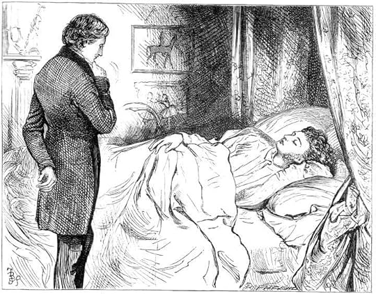 Now, as to whether Browne’s illustration is packed with so much meaningful detail is in the eye of the beholder, and, of course, I am a Phiz fan. So yes, I can align myself with the commentary. For a bit of suspense let’s just question the statement that Cohen sees above Clara’s head a copy of Raphael’s “Transfiguration.” Did Phiz really mean to represent such a painting with a tiny reproduction in the bedroom? Can it be a key and not a cross above the bed?