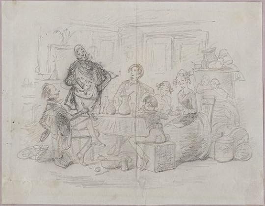 The only detail in the illustration not actually described or implied in the text is Phiz's comic touch of having Traddles' empty glass fall off the table, the "bumper" already having been consumed. Uncharacteristic of this Phiz interior is the absence of paintings that support an interpretation of the scene, but then these are after all rooms rented for a short time rather than a long-term residence — and the Micawbers by now have already pawned or sold most belongings of any value, including, presumably, paintings.