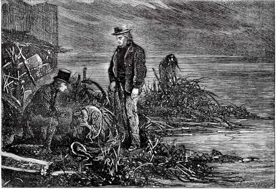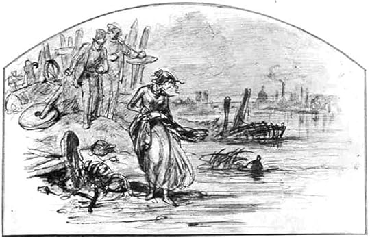 The scene sketchily suggests the river water and a piece of detritus on the shore, but focuses the reader's attention on the skeletal, wind-swept figure and haggard visage of the woman lost morally and socially in the great metropolis. Were this a Phiz composition, we would almost certainly label it a "dark plate" since it conveys effectively the atmosphere of a night scene.
