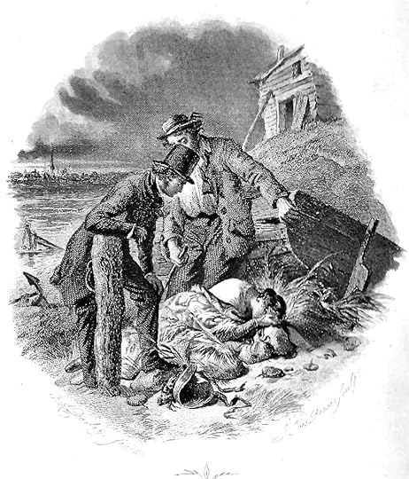Darley might have chosen the title "Saved from Self-destruction"; certainly inventing such captions rather than choosing appropriate quotations is unusual among Darley's illustrations in the so-called "Household Edition" (1861-1871). In the parallel scene in the original serial, Phiz's The River for Chapter 47, "Martha" (August 1850), the background includes the dome of St. Paul's, whereas Darley includes only the spire of one of Sir Christopher Wren's city churches — possibly Southwark Cathedral rather than St. Magnus Martyr on the City side. On the other hand, Fred Barnard's version, "Oh, the river!" she cried passionately. "Oh, the river!" for the Household Edition includes no contextualizing landmarksexcept the decaying "old ferry-house" noted at the beginning of Chapter 47, although the illustrator has developed the weeds and sedge in the foreground to imply the unpleasant nature of the river shore at Westminster where Martha has attempted to commit suicide. For the first of two August 1850 illustrations, Phiz chose to realize the emotionally charged moment at which the despondent Martha, formerly a seamstress at Yarmouth, is about to drown herself at Millbank Pond on the Thames, the area's industrial wasteland forming a psychic backdrop for her attempted suicide which reprises Meggy Veck's attempted suicide in Trotty's dream vision at its culmination in The Chimes, Margaret and Her Child, which likewise describes the plight of the Fallen Woman. The channel marker (left) is not something that Dickens mentions, but the small objects on the sand in the foreground and the wooden boat (intended to stand for "boats and barges astrand in the mud")to the right are intended to create an appropriate sense of "corruption and decay" Darley gives no sense of the shadow of the iron bridge, "the lights crookedly reflected in the strong tide." However, the illustrator effectively employs the dark clouds to create an appropriately gloomy atmosphere. Here is melancholy investing all surrounding objects, but the illustration lacks the iron detritus of the industrial revolution, the "clash and glare of sundry fiery Works", the pall of chimney smoke, and the "ooze and slush of the ebb tide" through which Fred Barnard communicates a sense of Martha's despondency.
