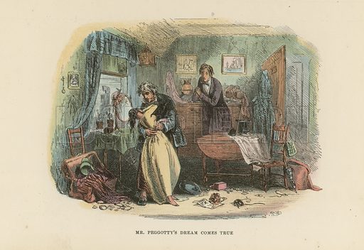 In this scene, entitled with sad irony 'Mr. Peggotty's dream comes true,' Browne fills her shabby room with pictures alluding to her past — of small children, a fisherman, a ship — and objects alluding to her lost virginity: the broken ewer, cracked mirror, smashed flower pot, empty envelope, discarded dance program, single dancing slipper, and abandoned bonnet and purse like Martha's in the earlier scene.