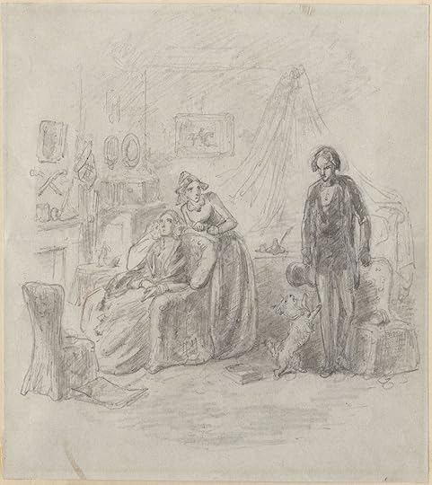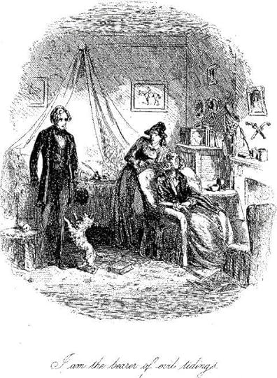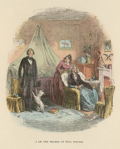 The pistols, picture of the horse and rider, and the fishing gear — "the many tokens of his old sports and accomplishments," David tells us (using generalizations of little use to the illustrator) — establish a male, sporting presence quite out of character with the elderly, white-haired invalid who now occupies the bedroom. Whereas in David's lodgings and his later Highgate home he appears consistently surrounded by books, signifiers of others' ideas, tales, and observations, here we notice a single book lying discarded on the floor. Even Steerforth's dog, an active terroir (a sporting breed) seeking David's attention, contrasts to the dog in David's world: Jip the spaniel, which is essentially a lap dog and extension of his mistress. The inclusion of the dog is not something suggested to Phiz by the text. So abstracted is David as he contemplates how the women will receive the news that he fails to notice the clamouring dog which (presumably) belonged to his dead friend.