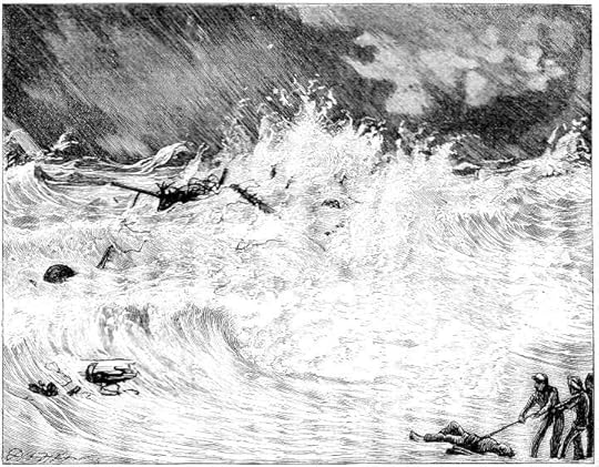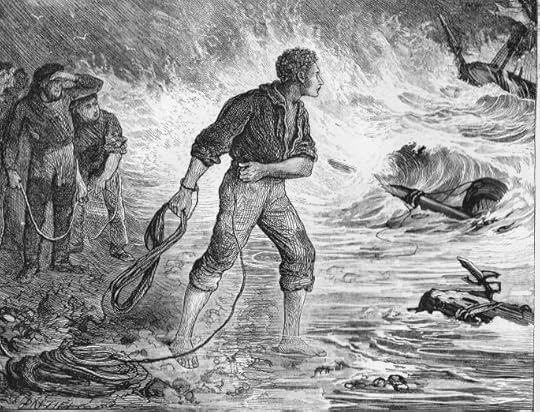 He rushes to the scene like the rest of the crazy town and sees the schooner being battered to destruction by the wind and waves and David tells us that the rolling and beating are too tremendous for any man to survive long. So there's a whole town full of people waiting to see a bunch of men killed in a storm, if they come for me to see it I'm not going anywhere. But now the crowd gets to see one mast had been broken off and the sailors onboard are trying to cut it away. As they watch several of the seamen are washed overboard to their death until only a single, curly-haired man remains alive on the foundering vessel. See, now who would want to watch this? The men on the beach had tried to reach the wreck with a life boat but couldn't and now all they could do is watch of course it is. I found this strange: