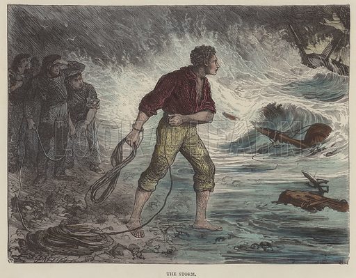 Ham watched the sea, standing alone, with the silence of suspended breath behind him, and the storm before, until there was a great retiring wave, when, with a backward glance at those who held the rope which was made fast round his body, he dashed in after it, and in a moment was buffeting with the water; rising with the hills, falling with the valleys, lost beneath the foam; then drawn again to land. They hauled in hastily."