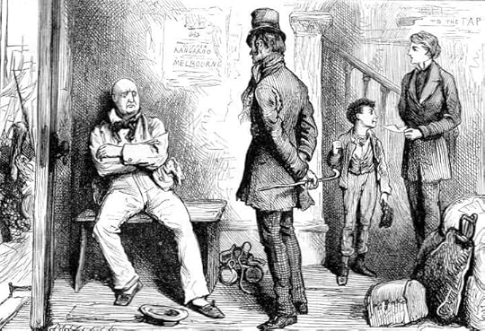 Anyway, on to the Micawber's. Shortly after this Traddles, who has been at Mr. Wickfield's "labouring ever since our explosive meeting" asks David, Agnes and Aunt Betsey to come to Mr. Micawber's house for a meeting. When they arrive Mr. Micawber tells them the move to Australia may be exactly what his family needs, and he wants to be sure that he arranges the finances between him and Miss Betsey professionally.