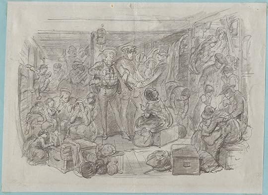 As is consistent with Ostade's genre paintings of Dutch peasant families, Phiz has chosen to depict in specific attitudes and postures the figures of emigrants suggested by Dickens: babies, crooked old men and women, ploughmen, smiths, and other adults of various conditions, classes, and occupations. Kitton noted in Dickens and His Illustrators (1899) that Phiz's original drawing of "The Emigrants," although in other respects consistent with the published version of the illustration, shows Micawber holding a telescope, a detail which Phiz or the novelist, wishing to maintain the seriousness of the scene, must have decided was not appropriate to the scene below decks. To avoid an unnecessary note of levity, the telescope was excised, but Micawber's diminutive sailor's hat and pea jacket remain,
