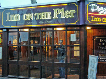 Large octagonal bar, TVs all round, emphasis on sport, choices of beers, pizzas and other traditional food, spectacular views of the Aber seafront and Cambrian coastline, and from autumn to spring thousands of starlings swooping to their roosts below the pier.