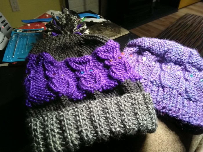 Here is a picture of the owl patterned hats with beads for eyes. Unfortunately, the beads don't turn out well in the photo. They look good in real life. The beads in the toque twinkle when the light hits them.