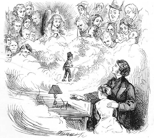 Barnard shows the mature David Copperfield and his second wife, Agnes, lower right, at his writing desk, with all the characters of the story, notably a waif-like David, centre, and above him, in the clouds, an angelic young woman (realized from the closing paragraphs of the letterpress, to the left of whom are the autobiography's less pleasant persons, notably Uriah Heep). The apotheosis of his former wife, Dora, which Barnard has chosen to effect in spite of the text's invoking Agnes as the great spiritual force in David's life, anticipates Coventry Patmore's treatment of marriage: