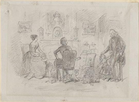 In the final illustration in the narrative-pictorial sequence, and discounting the ornamental title-page and frontispiece as flashbacks, the story essentially comes to closure with respect to the David-Agnes romance. The boy who had nothing but the rags on his back as he approached Dover is now a comfortably circumstanced middle-class parent of a growing family, a benign Victorian pater familias in contrast to the despotic stepfather who killed his mother with unkindness. Testifying to the source of his wealth and respectability, books lie strewn across the floor, as if (however unlikely) these have been the playthings of the Copperfield children, the building blocks of cognition and sensibility, so to speak, analogous to the physical building blocks with which little Agnes has been playing. Since another few years will pass in the succeeding chapters before we arrive, so to speak, at the present, the year 1850, we may assume this domestic scene and reunion with Dan'l Peggotty occur in the mid-1840s, when both Charles Dickens and Queen Victoria had growing families: while Dickens's oldest child was a boy (Charles Dickens, Junior, born 6 January 1837), the Queen's oldest child was Victoria, the Princess Royal, born in 1840, and was therefore about five years of age (roughly the same age as the child named for after her mother, Kate Dickens, born 31 January 1839) when the scene is set chronologically. Interesting but by sheer coincidence, both couples, Charles and Catherine Dickens and Victoria and Albert, each had nine children survive infancy. There are certain similarities between this picture of the Copperfield family and that of the Royal family in The Illustrated London News in the 12 October 1844 issue: "The Crimson Drawing-room: — Introduction of Louis Philippe to the Infant Royal Family".