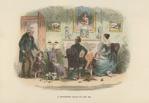One should add, as Phiz's including so many books again in David's domestic situation implies, that the present idyllic scene is also made possible by the fruits of David's imagination, so that, in a sense, the scene contains two varieties of Copperfield children. The scene to the right of the fireplace, then, corresponds with the title-page vignette, while the picture to the left appears to be an old house, possibly the Blunderstone Rookery, which in a different view is the subject of the frontispiece. The angels whose presence Cohen notes do not in fact represent the twin angels of David's life, Dora and Agnes, since one (right) is clearly male, so that the logical construction to place upon the sculptures is that they are analogues for the destined couple themselves. The picture of Dora is unchanged since "My child-wife's old companion", although less dark and therefore more easily discerned in its details; since the posture and the off-the-shoulder dress are the same, one is tempted to note that, whereas Agnes was wearing a more modest dress suitable to the gloomy mood in the earlier plate (in which she is about to announce Dora's death), now Agnes is wearing a dress in precisely the same fashion, a subtle suggestion that she has replaced Dora in David's life. Daniel Peggotty, a respectable dressed, affluent, old farmer, seems to have aged dramatically since his last appearances (in "The Emigrants" and "Mr. Peggotty's dream comes true"), and the wild-haired Copperfield boys resemble the Micawber twins in "Restoration of mutual confidence between Mr. and Mrs. Micawber". A significant difference is the size of the chairs in each drawing-room scene, for whereas David's chair is much larger than Dora's armless chair (identified by the guitar and music folio leaning against it) in the former scene, in the latter scene David and Agnes occupy chairs of similar size and design, suggesting their intellectual and moral equality. Nevertheless, in terms of composition, one chair has its back to the viewer in each scene; however, while that chair is vacant in the former scene, in the latter it is occupied by David (once again shown in in profile), who formerly was wrapped up in his melancholy thoughts of the ailing Dora but now turns away from the fire to welcome Mr. Peggotty. Although Fred Barnard also provides an illustration for ch. 63 in the Household Edition of the novel, the "stranger" is not in fact Mr. Peggotty; rather, the Barnard plate realizes a moment in the sixty-fourth chapter, when Mr. Dick fashions and flies kites for David's boys in the summertime.