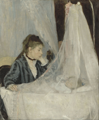 Morisot mostly painted glimpses into women’s private spaces: a young woman combing her sister’s hair or a mother tending her children. In The Cradle (1872), among Morisot’s most famous works, Edma gazes at her sleeping infant, Blanche. Edma’s left arm is bent, creating a mirror image of the child, who is veiled by the gauzy white curtain. The viewer has wandered into a scene of palpable intimacy.