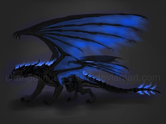 He stands at 12 ft from claw to head, he is 14 feet long from head to tail and when his wings are spread out they are 7 feet long each. He has midnight black scales with a few white scales mixed in on his chest his wing membranes are a dark fiery blue that glows in the dark. He has bright blue luminescent scales along his back, tail, on his head. He has glowing icy blue eyes. He is very muscular and is a very fast swimmer and flyer.