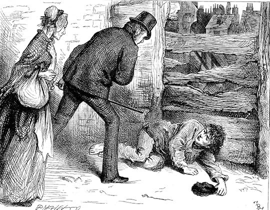 Whereas Phiz had set a sombre mood for the chapter with the dark plate entitled Tom-all-Alone's (May 1853), a plate with no figures whatsoever, Barnard has realised Dr. Alan Woodcourt's confrontation with Jo, the crossing-sweeper. The physician has responded to a woman's cry of "Stop him!" (suggesting that the boy has just stolen something), and now hears how Bucket drove the contagious street urchin out of Bleak House, put him in a hospital, and given him a little money. Believing that he is dying, the boy has now returned to his familiar neighbourhood, where he expects to expire in the street, not far from Nemo's resting place. Jo is oblivious to the fact that he infected Charley, Esther Sommerson's maid, and thereby infected her mistress with smallpox, too.