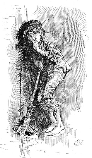Whereas Phiz had set a sombre mood for the chapter with the dark plate entitled Tom-all-Alone's (May 1853), a plate containing no figures whatsoever, and a dominating church spire (for the purpose of irony), Furniss has simply depicted Jo and his broom at the point in the text when Dr. Alan Woodcourt runs him down. The physician has responded to a woman's cry of "Stop him!" (suggesting that the boy has just stolen something), and now hears how Inspector Bucket drove the contagious street urchin out of Bleak House, put him in a hospital, and given him a little money. Believing that he is dying, the boy has now returned to his familiar neighbourhood, where he expects to expire in the street, not far from Nemo's resting place. Jo is oblivious to the fact that he infected Charley, Esther Sommerson's maid, and thereby infected her mistress with smallpox, too. There is neither indignation nor sentimentality in Furniss's portrait of the homeless, parentless urban waif, but there is considerable sympathy in the cowering urchin's timorous look, as if appealing for middle-class compassion and understanding.