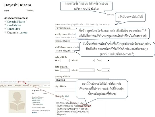 การเพิ่มนปก.อื่นๆให้นักเขียน หรือต้องการเปลี่ยนวิธีการแสดงชื่อนามสกุลนักเขียน (มันจะขึ้นนามสกุลก่อนชื่อแบบอัตโนมัติตามวิธีการเรียกชื่อในภาษาอังกฤษ) ให้กด edit data จากหน้าที่เป็นนามปากกาของนักเขียน