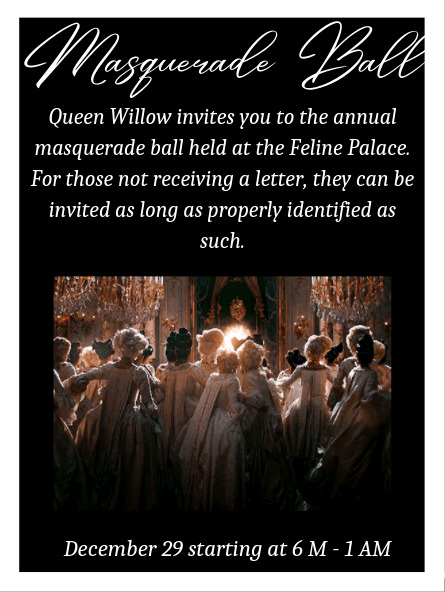 The time and date doesn't apply to IRL and will actually start on December 2. We'd like active members to do this roleplay seeing as it will have a lot of people involved. You have to have more than one OC at the ball and responses must be 6+ sentences. If you take more than 8 hours to respond, your turn will be skipped. If you aren't going to respond, let people know. The timezone is EST, and if your timezone is very different then please let people know so your turn doesn't get skipped.