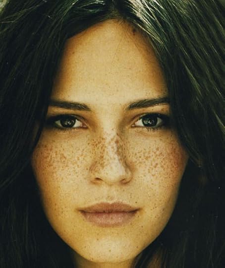 Distinct Features: Dark, defined eyebrows that are slightly bushy, dark freckles on face and shoulders
