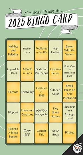 ・You may substitute ONE square from the 2025 card with a square from a previous r/Fantasy bingo card if you wish to. EXCEPTIONS: You may NOT use the Free Space and you may NOT use a square that duplicates another square on this card (ex: you cannot have two 'Goodreads Book of the Month' squares). Previous squares can be found via the Bingo wiki page.