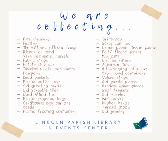 We know some of you start spring cleaning early in January! When you start going through those closets think about items you might donate to the library. We like to reduce, reuse, and recycle as many materials as we can for Summer Reading art projects!