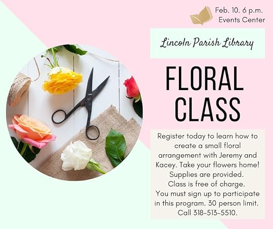 Floral Class Register today to learn how to create a small floral arrangement with Jeremy and Kacey. Take your flowers home! Supplies are provided. Class is free of charge. This class is limited to 30 people. You must sign up to participate in this program. Call 318-513-5510