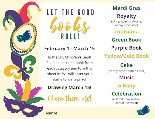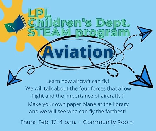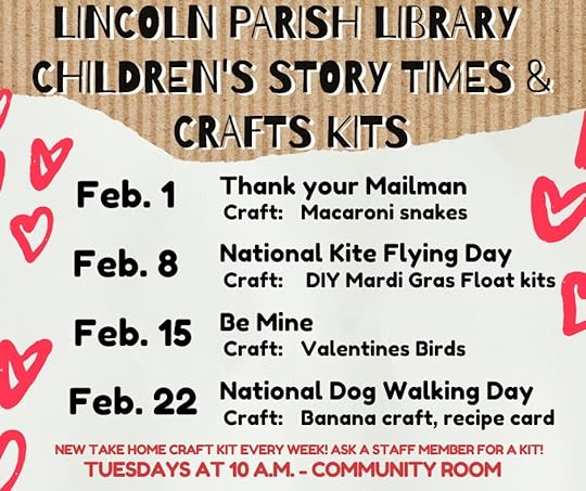 Children's Department The Weekly Take Home Craft with storytimes February 1= Thank your Mailman Craft: Macaroni snakes February 8= National Kite Flying Day Craft: DIY Mardi Gras Float Kits February 15= Be Mine Craft: Valentine Birds February 22= National Dog Walking Day Craft: Banana craft, recipe card