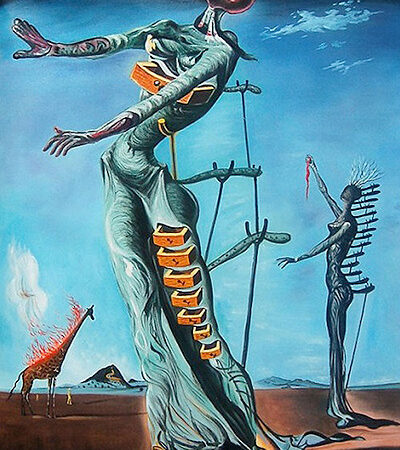 In the background of Salvador Dalí’s “The Burning Giraffe”, another female figure can be seen on the right side of the painting. She looks a lot like the first woman, and she also has a few golf clubs sticking out strangely from her back. Sparkling branches grow from the head. In her right hand, she holds a raised red belt, symbolizing victory.
