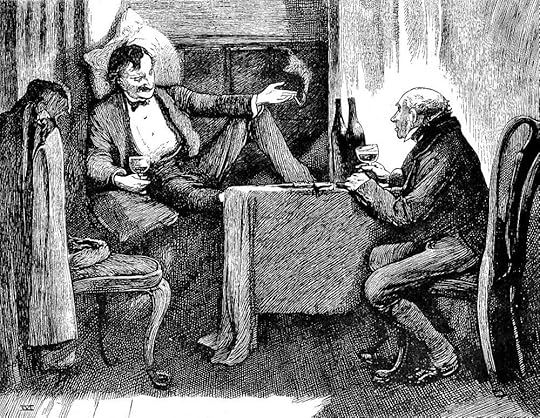 Although in this passage from Little Dorrit Blandois orders a single bottle of port, and the pair consume two further bottles, in the Mahoney illustrationthe pair are in the process of consuming the second bottle of the fortified wine, apparently without much effect on Mr. Flintwinch, who seems bent on patiently bent on drinking the Frenchman under the table when Blandois calls a halt with the end of the third bottle. In the illustration, the expansive Blandois already seems to be succumbing, although he is hardly an inebriate of the rank of Bob Sawyer, the alcoholic medical student and pharmacist of Dickens's first novel so often shown with either a glass or bottle in his hand, as in Conviviality at Bob Sawyer's (May 1837) and Mr. Bob Sawyer's Mode of Travelling (October 1837). Ironically, Dickens himself was relatively abstemious.